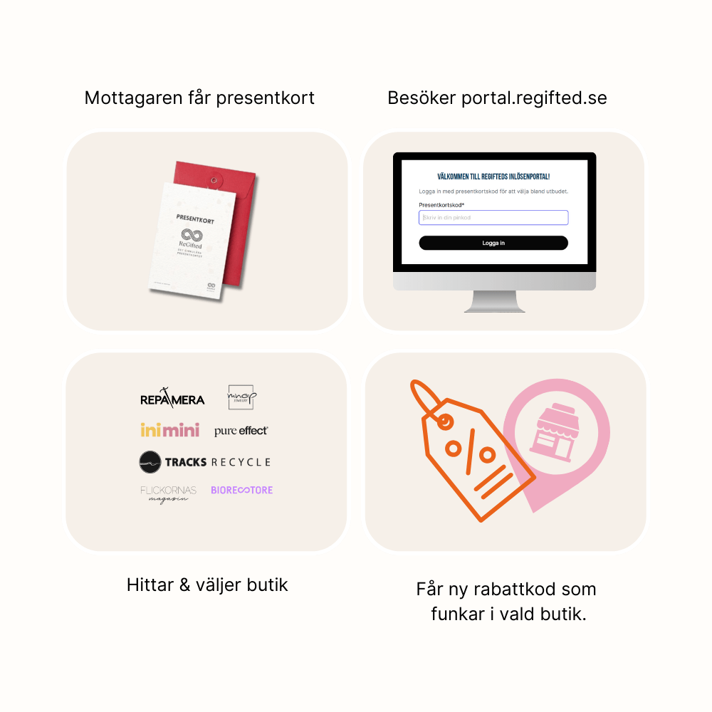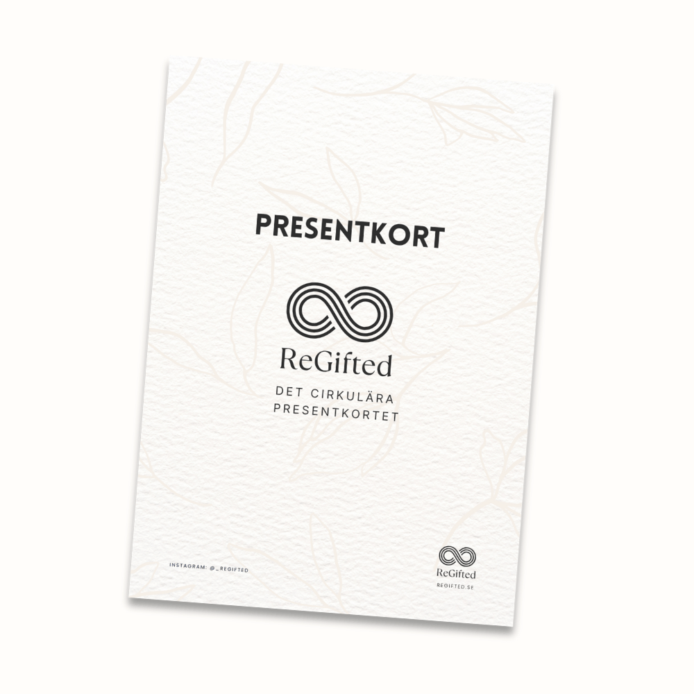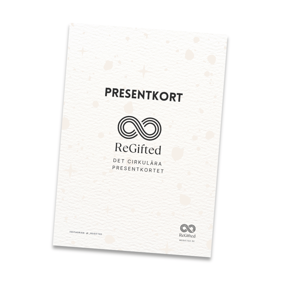 ReGifted är Sveriges första cirkulära samlingspresentkort – ett enkelt och meningsfullt sätt att ge en hållbar gåva vid jul, jubileum eller som ett varmt tack till medarbetare, kunder, vänner eller familj.
